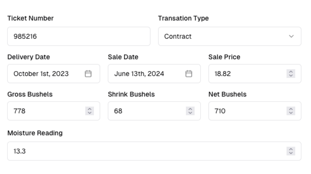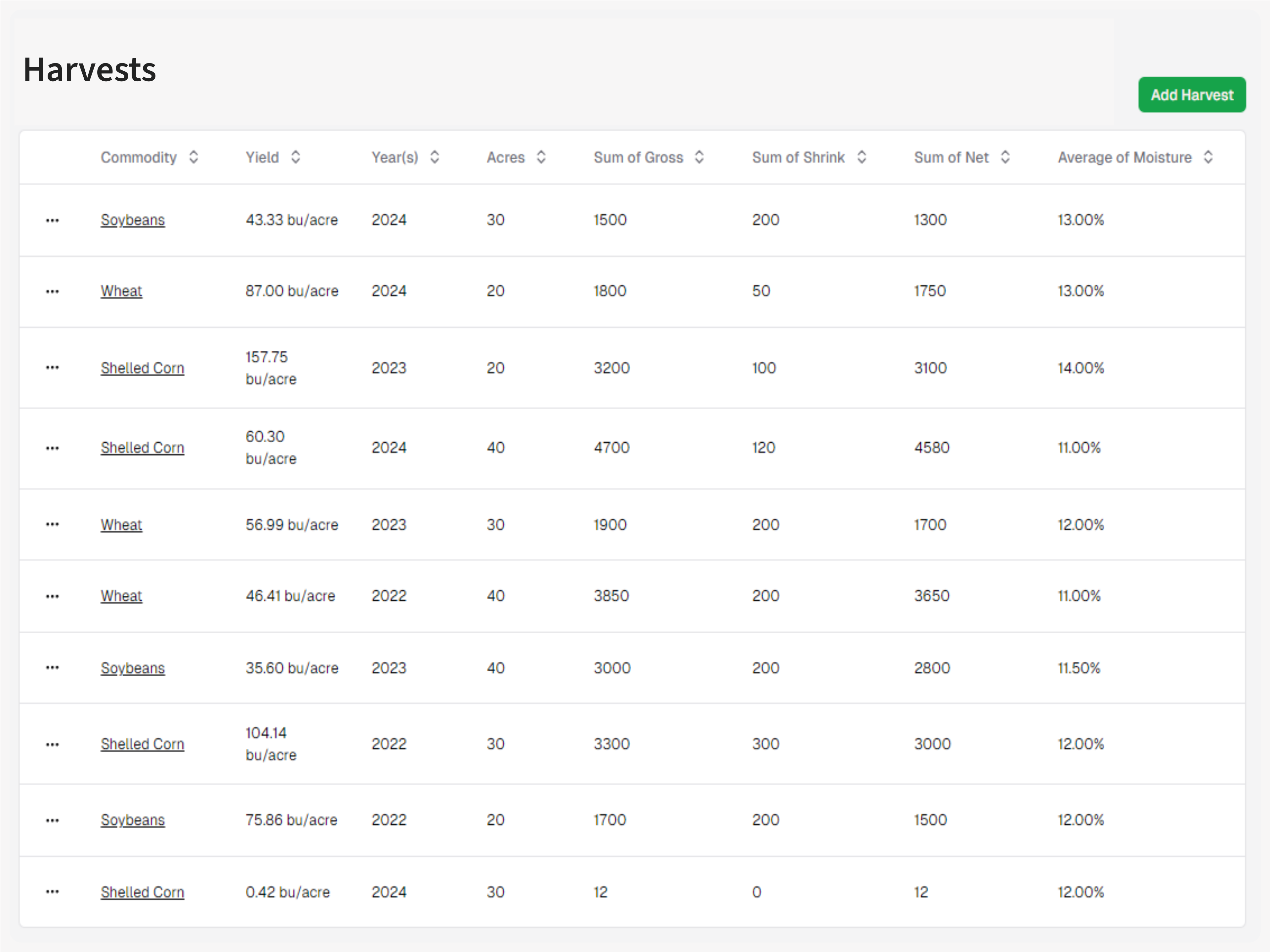 Enter elevator tickets to calculate harvest. Monitor farmed acres, yield, moisture, sale information and more.