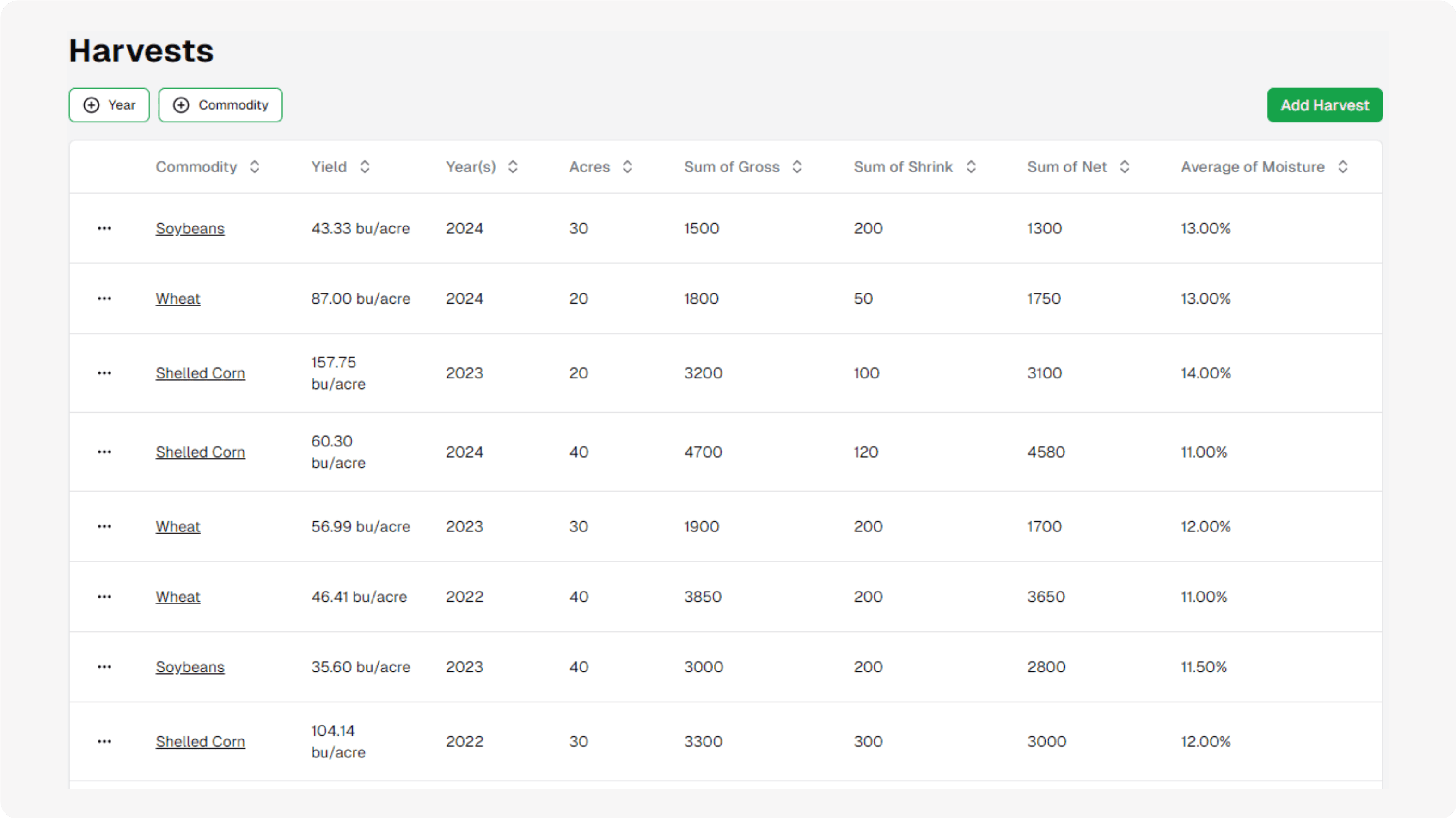 Enter elevator tickets to calculate harvest. Monitor farmed acres, yield, moisture, sale information and more.